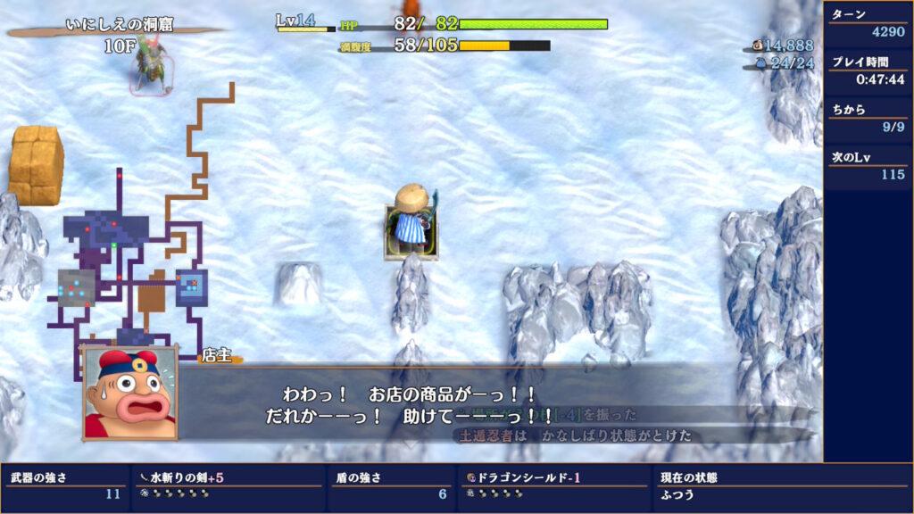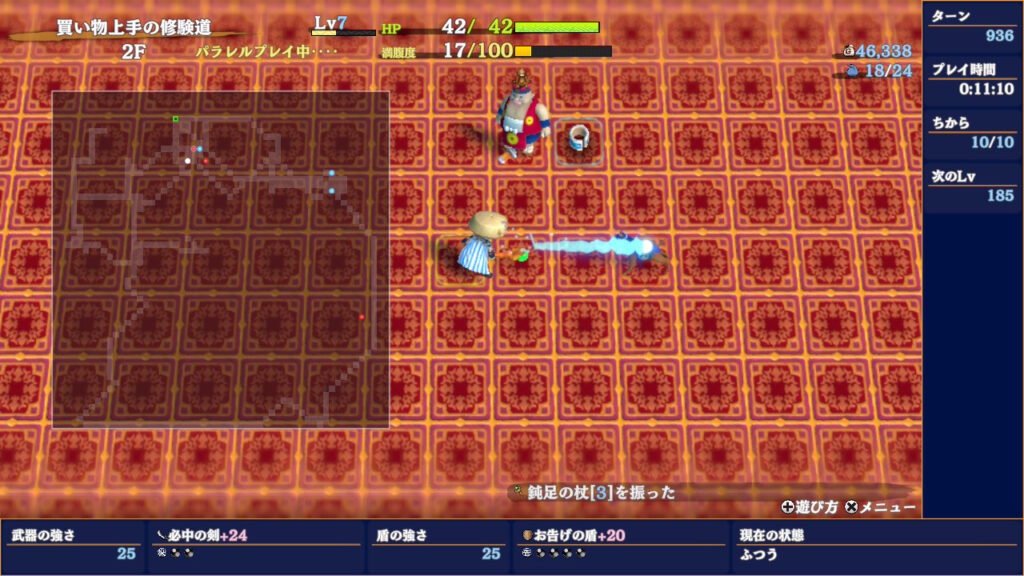 その際、例えばお店でアイテムなどを売り、必要なものを拾う前の状態で店主に「かなしばりの杖」を振れば、後はアイテムを拾って階段に辿り着けばどろぼう成功になります。