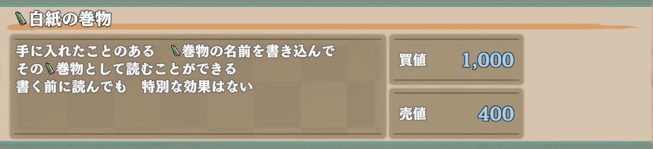ちなみに「おにぎりの巻物」は「買値400ギタン」の巻物の一種ですが、400ギタンのグループは