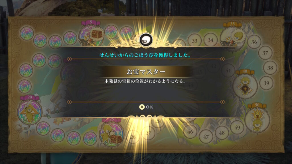 このタイミングでせんせいを25回見つけた報酬が手に入りました。どうやら宝箱の位置がわかるみたいです。これがあれば地上戦艦の合体術逃さなかったのにね!
