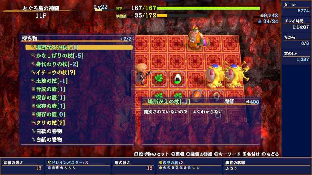 合成の優先順位については10〜11Fの所で書いた通りですが、「合成素材もうないよ!」っていう時はダブった杖をまとめられないか確認しておくといいです。