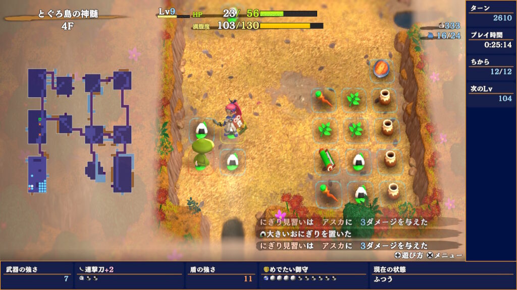 ②については、主に2〜4Fで実施するニギライズに使うのが主ですが、序盤の厄介な敵(鬼サソリ、ポリゴン)を大体一撃で倒せるのも結構強いです。