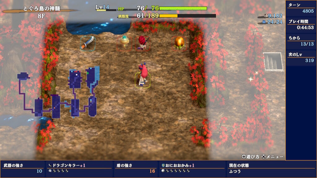 とぐろ島の神髄はわかりやすく序盤でニギライズができて、食料問題については気にしなくていいことが多く、その後の稼ぎも非常にやりやすい部類のダンジョンです。