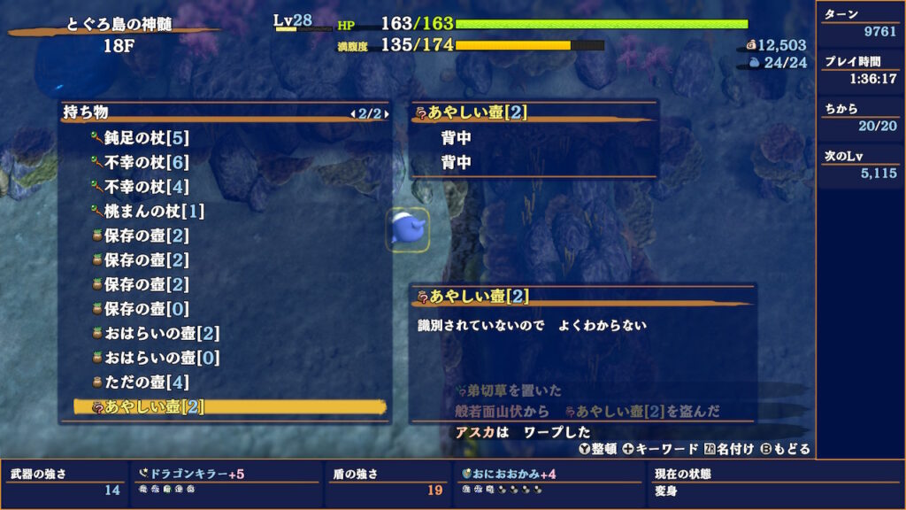 デッ怪は今後も特定のフロアで出る可能性がありますが、周辺の敵が厄介だったり、そもそもアイテムより逃げ切りが大事になる終盤だったりと意外と恩恵を受けれるフロアが少ないです。