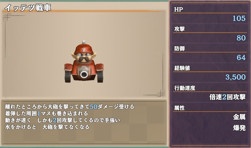の2つで、特にレベルの高いイッテツ戦車はダメージもデカいしなんか2回攻撃してきます。