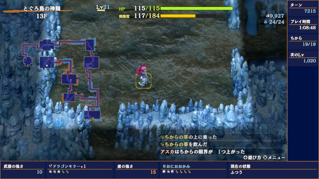 また、識別・ハラヘラズ・忍び足効果は同フロアで一度だけ発動するので、体力全快状態でこの3つの効果を引いてしまえば、後はちからがあがるだけとなります。